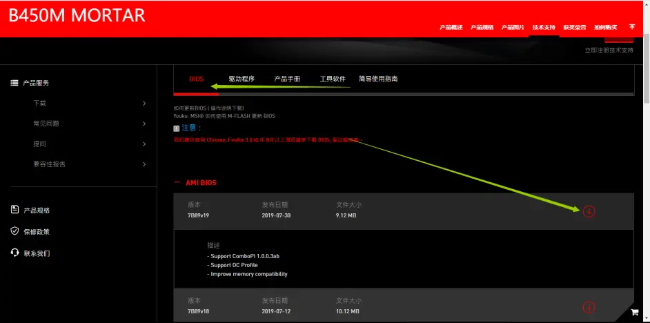 在BIOS一栏中下拉找到下载,一般下载最新版本 AMD家的A320、B350、B450、X370等主板注意,某些主板的新BIOS不支持速龙和一代锐龙的CPU,根据情况选择版本下载!