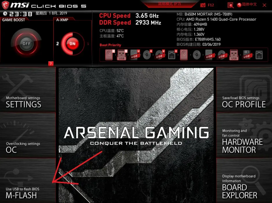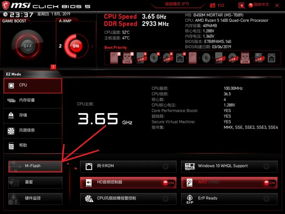 刷BIOS之前先把你改好的BIOS文件重命名成和原文件一样的名字,不然有些主板不会读取,然后放进FAT32格式的U盘里面,然后重启按着键盘的“Del”键进入BIOS(不同主板可能操作不同,具体请百度)以微星主板为例(其他主板有不同刷BIOS的功能):进入BIOS,无论是建议模式还是高级模式,左下角处都会有一个“M-FLASH”的按钮,如图: