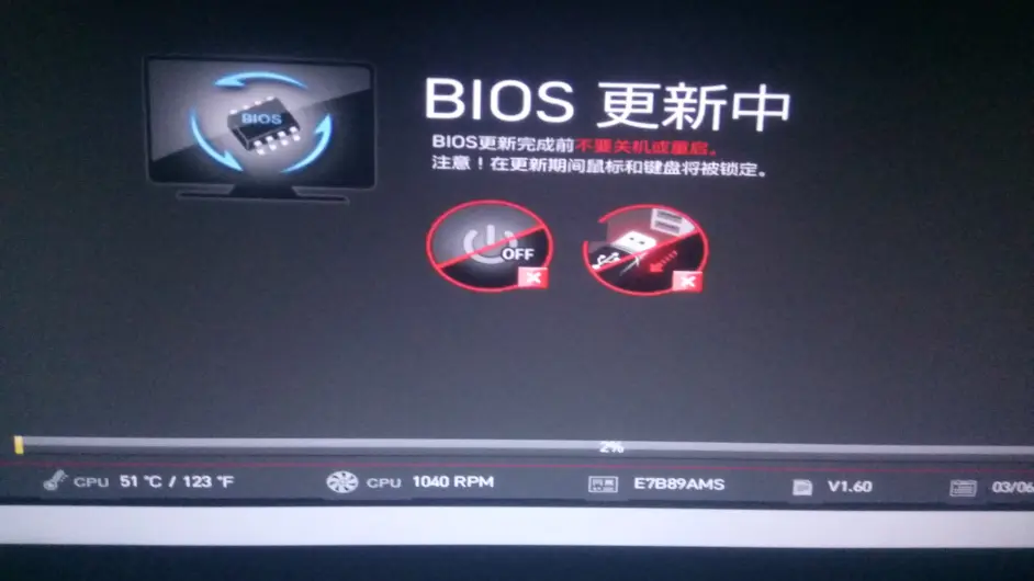 这样就开始刷啦。!!!注意!!!刷BIOS的时候确保不要断电,还有U盘不要松动,出现任意一点情况,你的BIOS都可能会刷坏(高端版当我没说)这个时候你只能带着主板返厂或者去电脑店叫老板帮你烧录一份BIOS